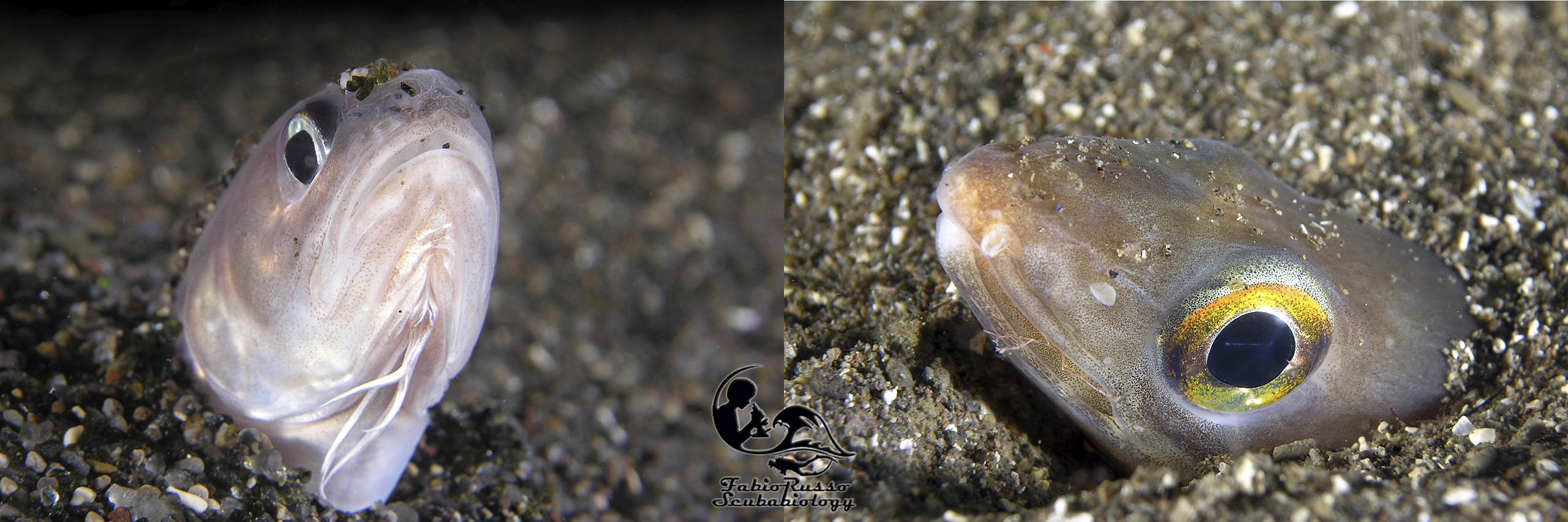 Cominciamo a guardarci intorno, effettivamente di giorno, soprattutto i fondi sabbiosi, sembrano veramente poco abitati, ma basta aguzzare la vista per vedere qualcosa, la mancanza di nascondigli ha trasformato gli abitanti della sabbia selezionando colorazioni criptiche, così i piccoli ghiozzetti (Pomatoschistussp.) sono praticamente uguali al substrato.