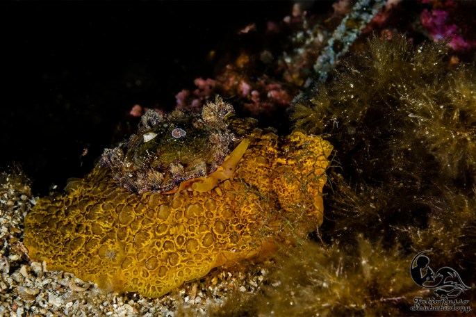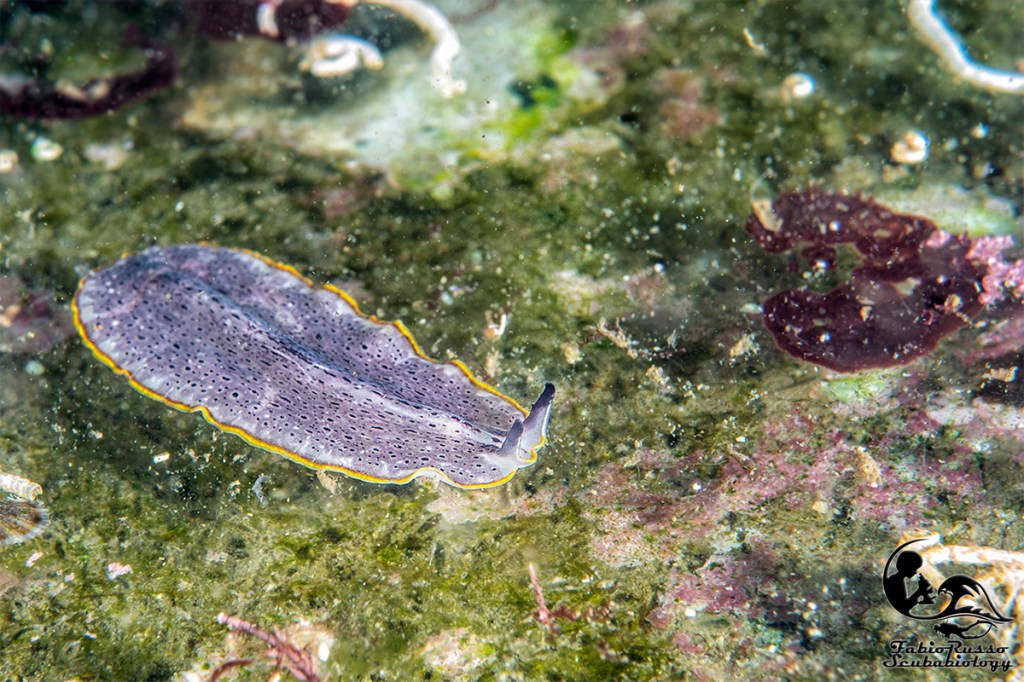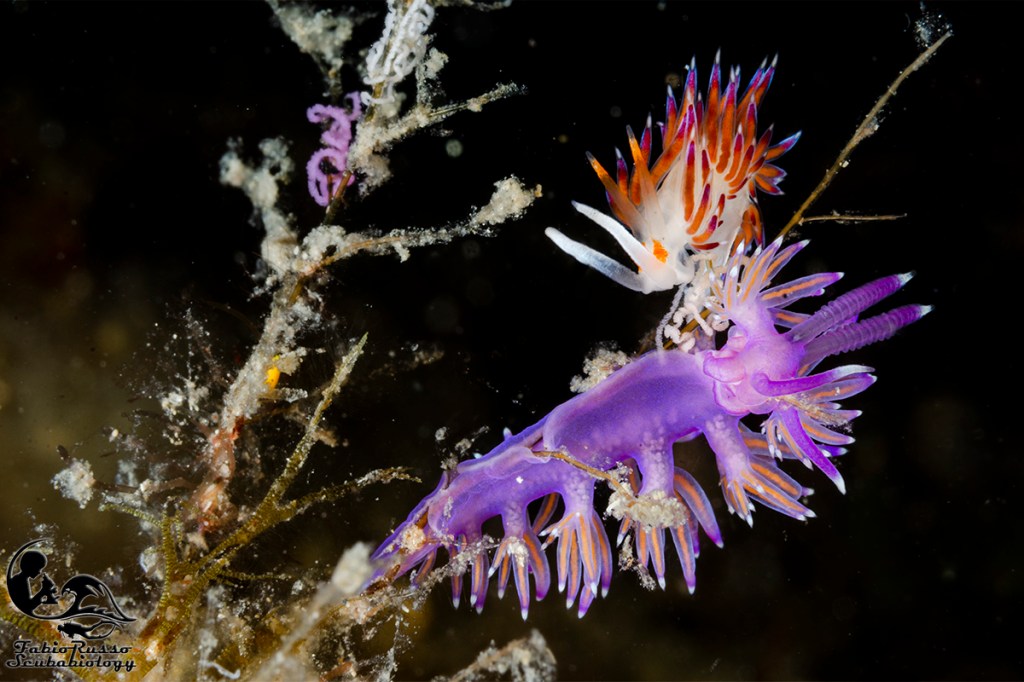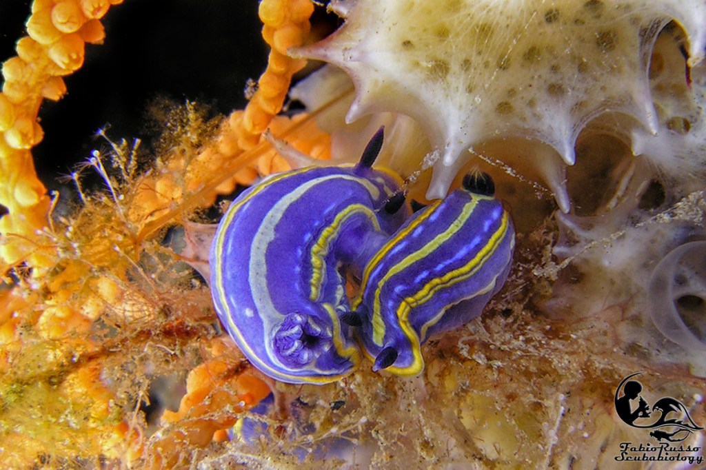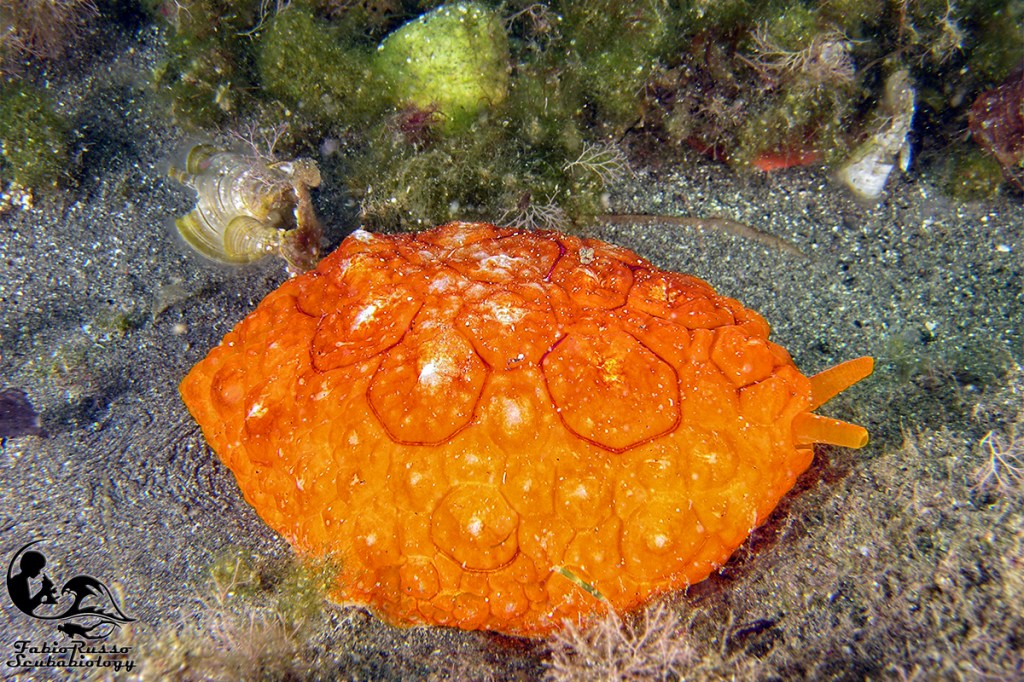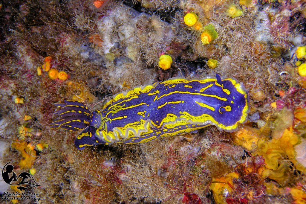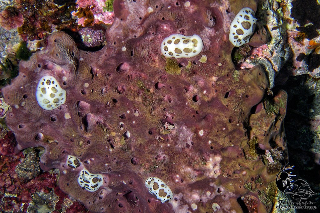 Fra i nudibranchi più comuni ci sono alcuni doridi come le vacchette di mare (Peltodoris atromaculata), questi nudibranchi dall’inconfondibile livrea pezzata (da cui il nome vernacolare) si nutrono esclusivamente della spugna Petrosia ficiformis, spugna che talvolta in grotta può essere completamente bianca a causa dell’assenza di alghe simbionti nei suoi tessuti. È incredibile pensare come un nudibranco così diffuso come la vacchetta di mare fosse considerato rarissimo sino a mezzo secolo fa.