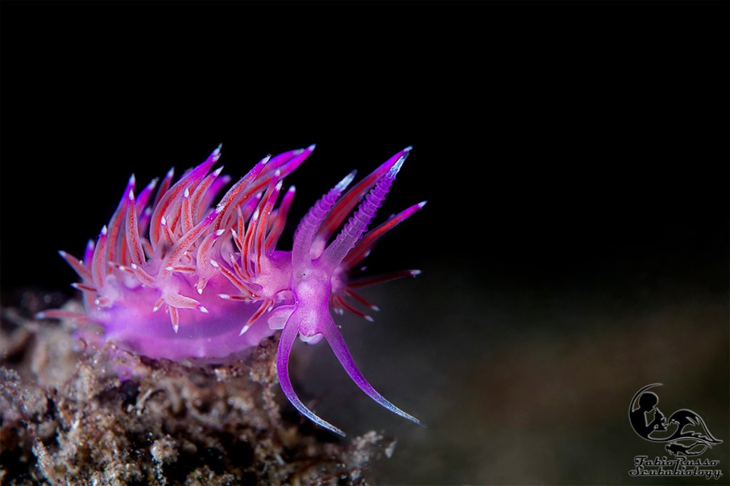 Un occhio di riguardo nel nostro piccolo excursus sugli opistobranchi va dato all’ordine dei nudibranchi (con branchie nude), si tratta, infatti, dell’ordine con il maggior numero di specie e di variabili di forme e colori. Solo in Mediterraneo si contano oltre 250 specie. Negli appartenenti a quest’ordine la conchiglia è sparita del tutto (anche se presente in fase larvale), pur chiamandosi nudibranchi in alcune specie troviamo la scomparsa delle branchie. Tutti i nudibranchi sono dotati di alcune appendici cefaliche, dette rinofori, con funzioni sensoriali (chemio ricettiva e tattile), mentre altre appendici boccali hanno solo funzioni tattili. I nudibranchi sono tutti zoofagi, spesso monofagi, ovvero si nutrono di un’unica preda che può essere una spugna, un celenterato, un briozoo, un’ascidia o uova di altri opistobranchi. Le specie che si nutrono esclusivamente di uova di altri opistobranchi hanno evoluto una capacità digestiva tale da poter rinunciare all’ano che quindi nel corso dell’evoluzione è sparito del tutto.