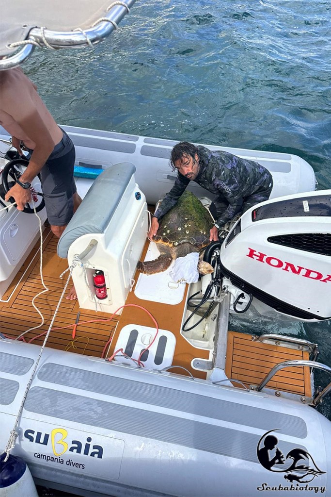 Da un lato ero molto concentrato sul recupero, dall’altro ero estremamente preoccupato di causare stress estremo a questa povera creatura e ogni tanto la sollevavo per accertarmi che respirasse. Ero quasi allo stremo quando provammo ad imbarcarla per la prima volta da poppa del gommone del diving. Non riuscendo a pensare lucidamente chiesi ad Andrea di afferrarla davanti mentre la spingevo dal posteriore. Poggiai la tartaruga sulla poppa e, quando il caro Andrea fece per afferrarla, l’animale sferrò un poderoso morso che Andrea schivò e che lo fece desistere.