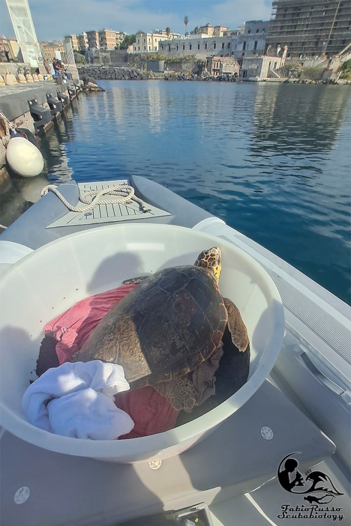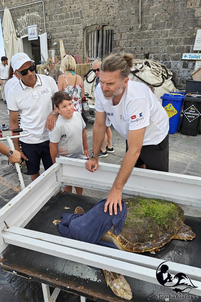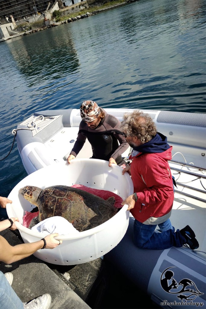 Arrivati a Portici ci attendevano già i ragazzi del Turtle point con Campanella pronta nel suo grande mastello di plastica bianco, mi prodigai subito per aiutare ad imbarcare l’esemplare a bordo.