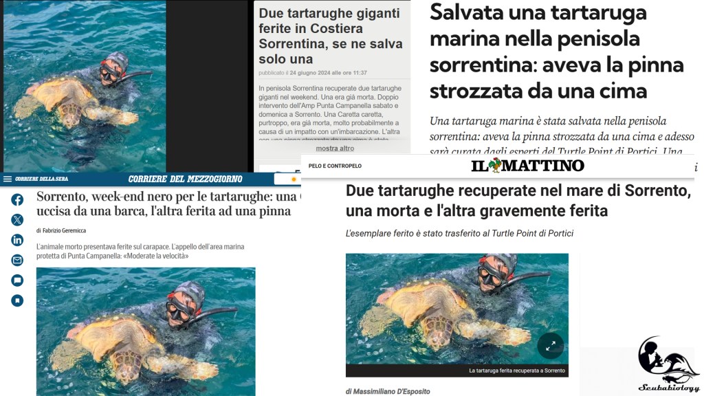 Purtroppo la notizia non solo era riportata con qualche errore, sia chiaro non grave, ma era stata offuscata dal ritrovamento di un altro esemplare, purtroppo morto per un impatto con un’imbarcazione, a Marina del Cantone, all’opposto esatto della penisola sorrentina rispetto a Sorrento!