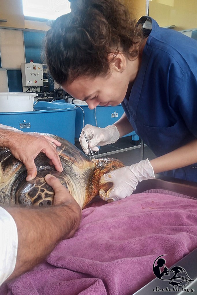 Purtroppo nelle altre vasche non tutti i degenti dell’ospedale se la passavano bene, Campanella era quella che stava meglio. Alcuni esemplari avrebbero dovuto aspettare almeno fino alla prossima primavera per essere rilasciati, perché non ancora pronti, mentre altri, i più sfortunati, non potranno mai essere rilasciati, troppo gravi le menomazioni per poter sopravvivere in natura. Alla vista di quest’ultimi il cuore mi si strinse. Lo scopo della detenzioni di questi esemplari non curabili è puramente didattico, si cerca di alleviare le loro sofferenze al minimo e di mostrare al pubblico l’impatto delle attività antropiche sulle specie di tartarughe.