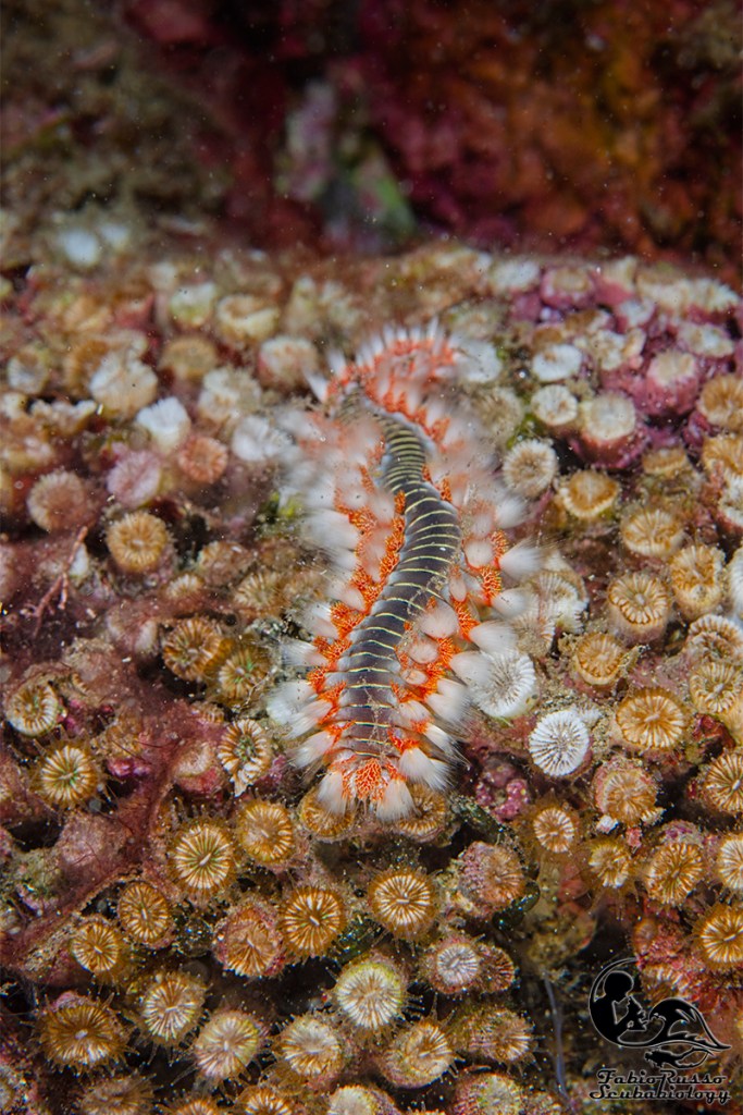 Quindi c’è una presenza storica nel golfo di Napoli, anche se estremamente sporadica visto che gli unici esemplari che abbiamo in collezione arrivano fra la fine dell’1800 e gli inizi del 1900. I primi incontri che, insieme ad altri sub, facemmo in penisola sorrentina risalgono al 2013 (attenzione ci sono alcune segnalazioni per l’area per primi anni ’70), all’epoca nella baia di Puolo (Massa Lubrense (NA)) incontrammo per molte volte quello che amichevolmente chiamavamo “il mostro”. Un enorme vermocane che avvistammo fino al 2019 e che nel frattempo crebbe fino ad arrivare all’incredibile lunghezza record stimata di 75 cm.