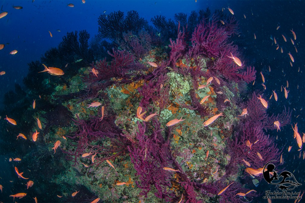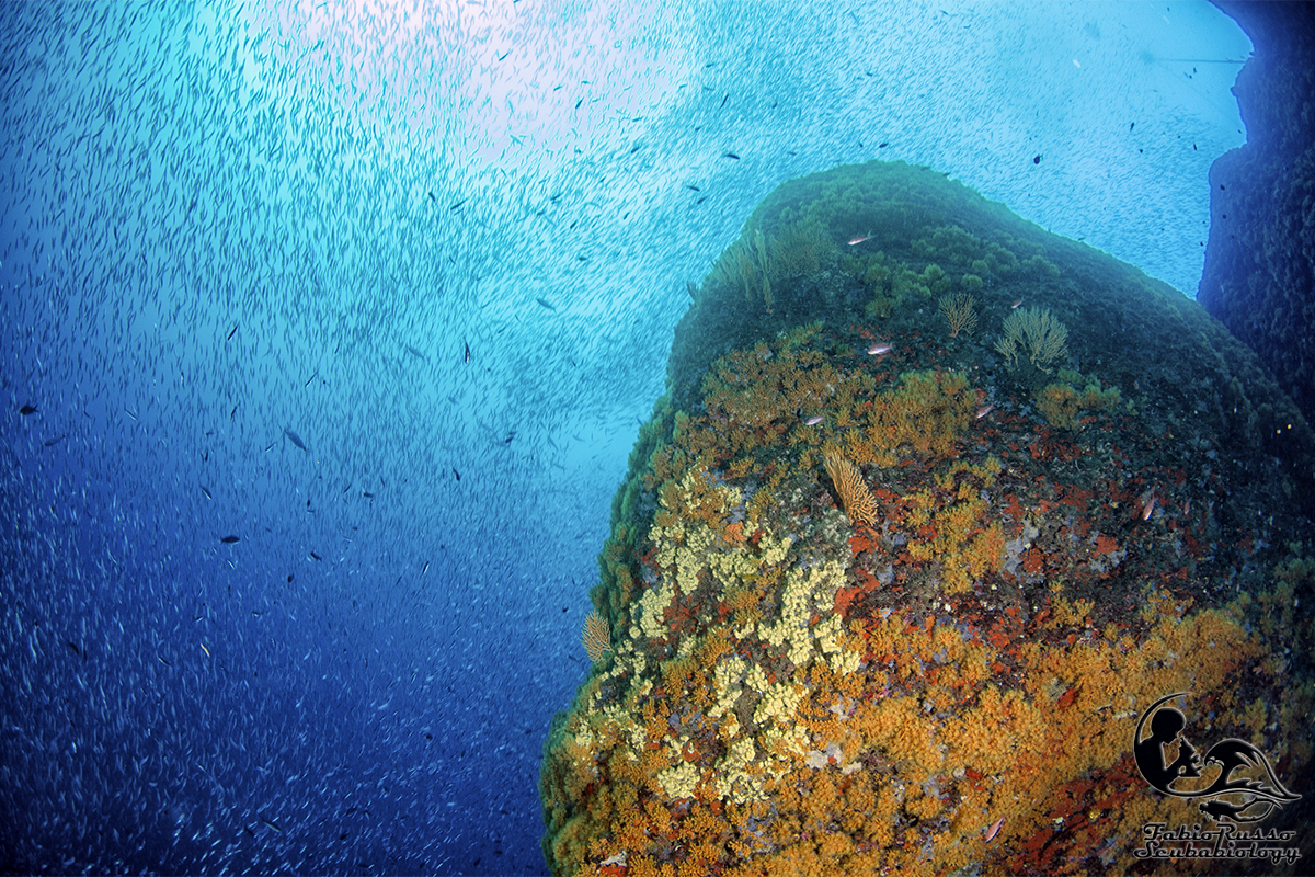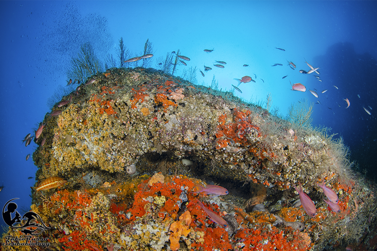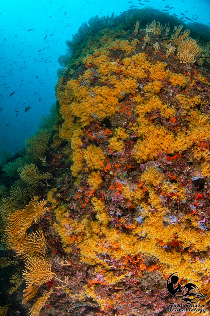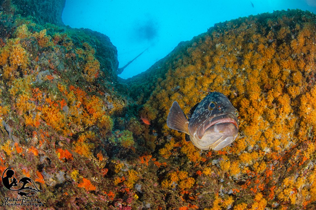 So benissimo che ciò che ricopre gli scogli colpisce molto poco l’immaginario del subacqueo medio e che qualcuno considera coreografia o (Dio mi salvi da un infarto) “vegetazione”, tutto quello che ricopre le rocce e non si muove, ma il banco non è ricco solo di vita bentonica: in realtà la fama di luogo magico per i sub è incentrata soprattutto sull’abbondante presenza di pesce.