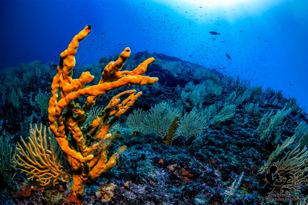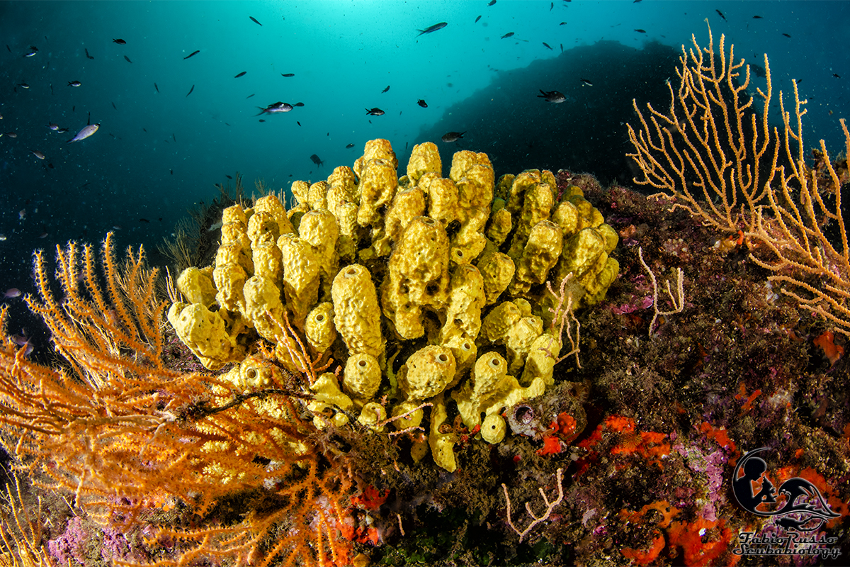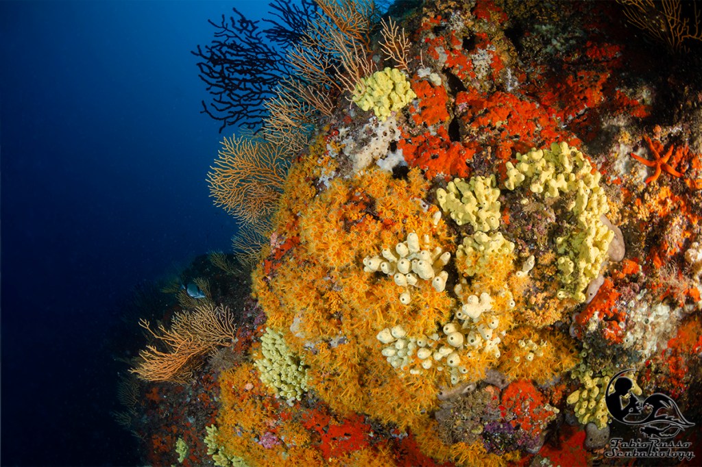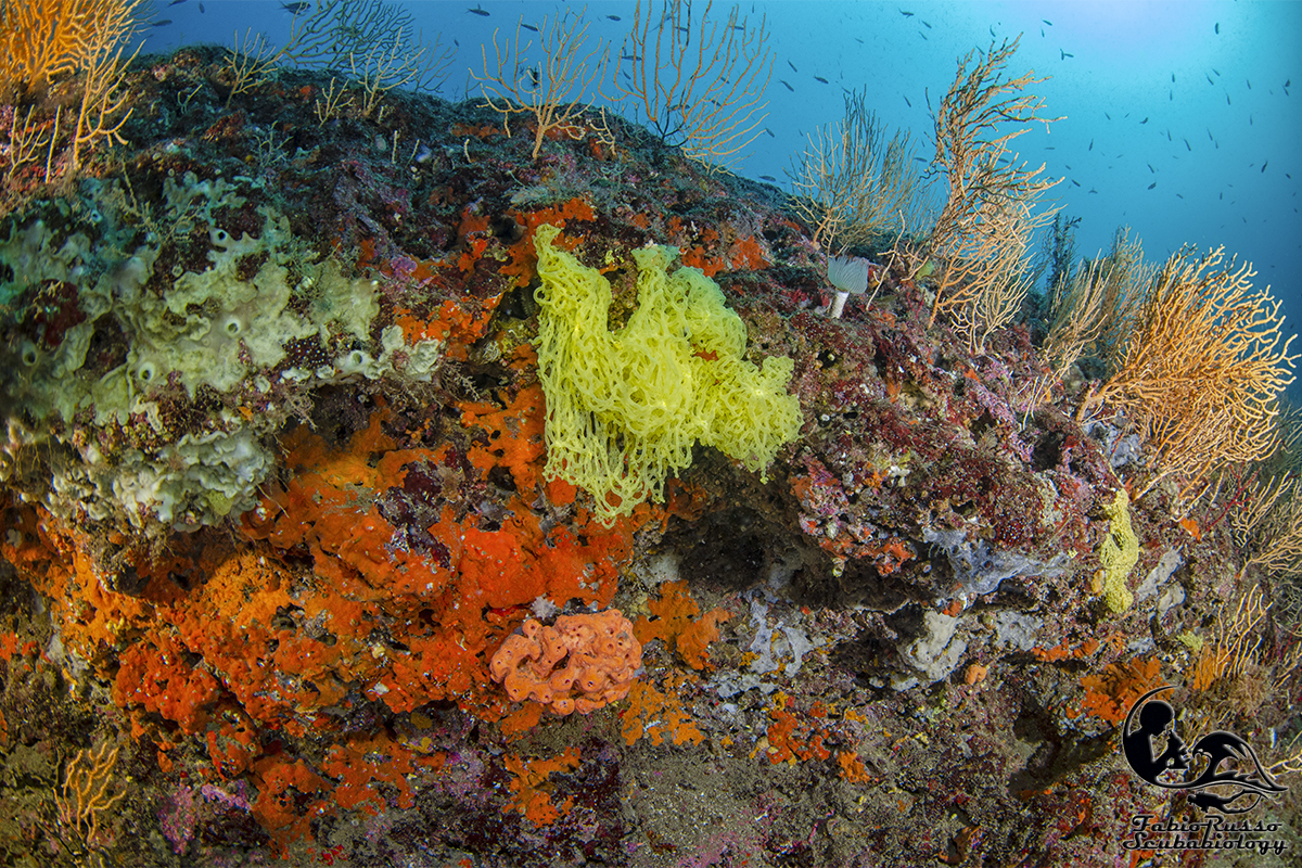 Gli scogli sono praticamente ricoperti di vita; la vita bentonica sessile è spettacolare, come lo è l’enorme varietà di spugne fra le quali spiccano le bellissime Aplysina.