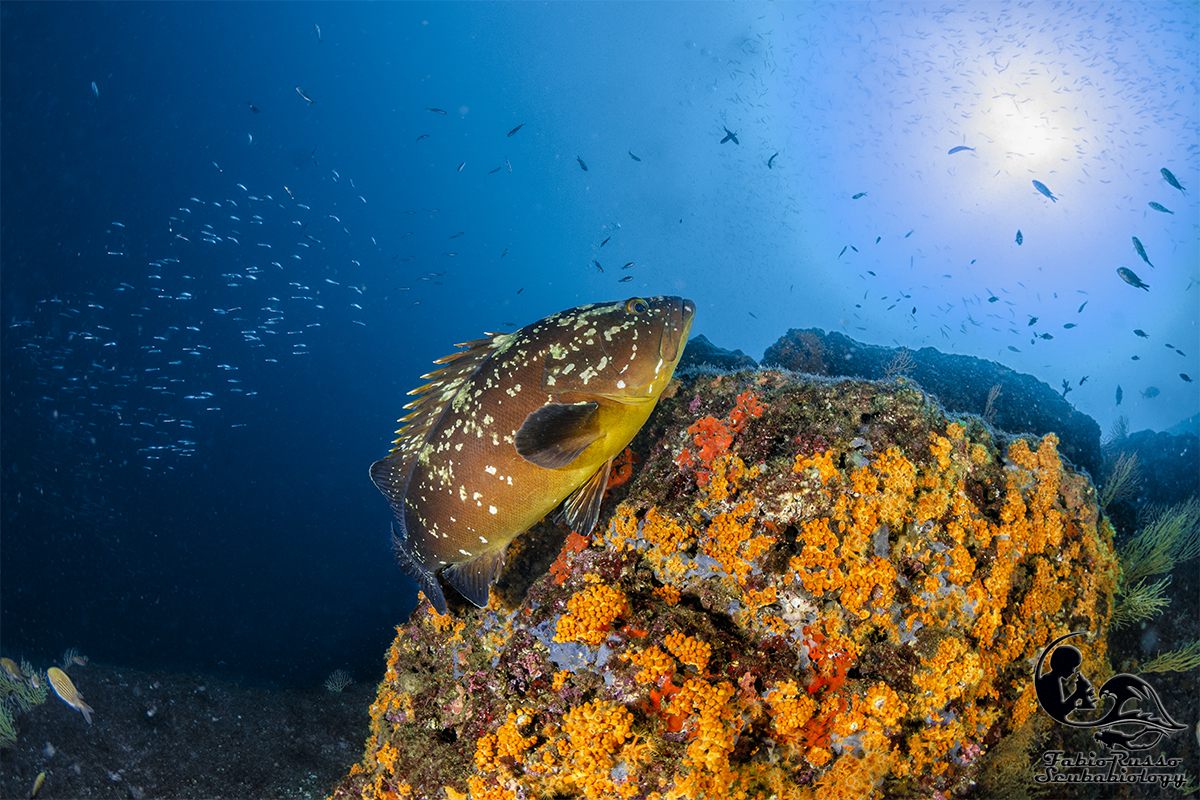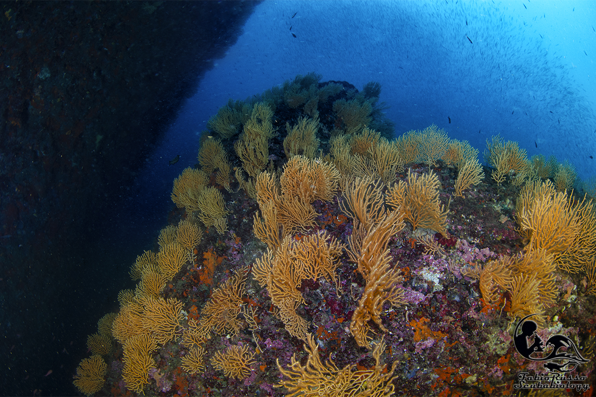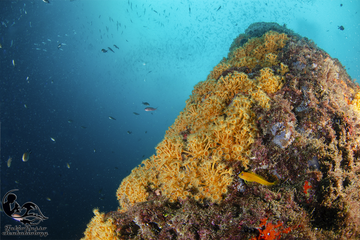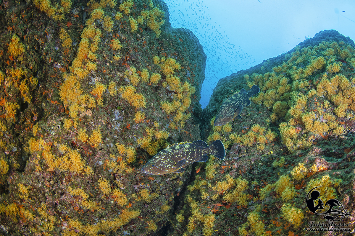 Gli scogli sono praticamente ricoperti di vita; la vita bentonica sessile è spettacolare, come lo è l’enorme varietà di spugne fra le quali spiccano le bellissime Aplysina.