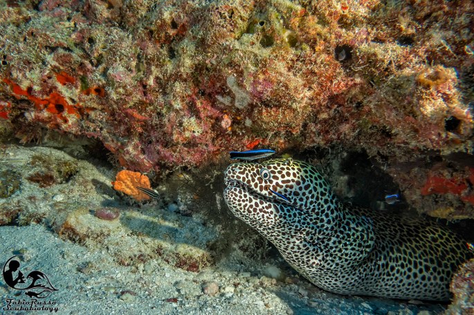 Tre esemplari di labride pulitore sono a lavoro su di una murena a nido d’ape (Maldive).